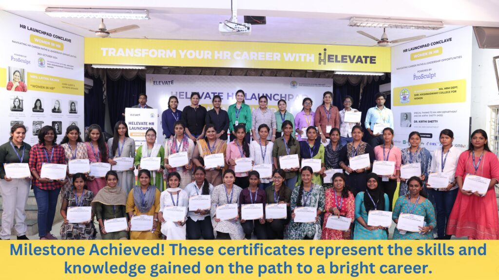 The recently concluded HR Launchpad Conclave and workshop exclusively for Women in HR, Presented by Helevate and powered by ProSculpt.co at Shri Krishnaswamy College for Women’s MA. HRM Department, which brought together thought leaders, industry experts, and emerging HR professionals to discuss critical topics on career advancement, leadership, and the evolving HR landscape. Focused on empowering women in HR, the event featured key speakers who shared their insights on navigating career paths and leadership opportunities for Women In HR.
